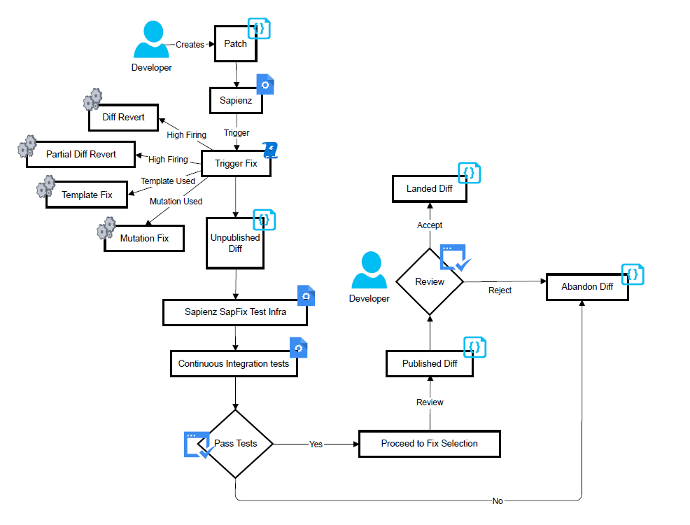 Trigger Fix: If Sapienz identifies a problem with the patch, it triggers a fix process. This is where SapFix evaluates the type of fix that may be required, based on the nature of the problem identified.