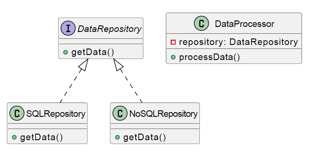 DataProcessor uses DataRepository, an abstraction, rather than a specific data source implementation. This decouples the high-level data processing logic from the low-level data access logic.