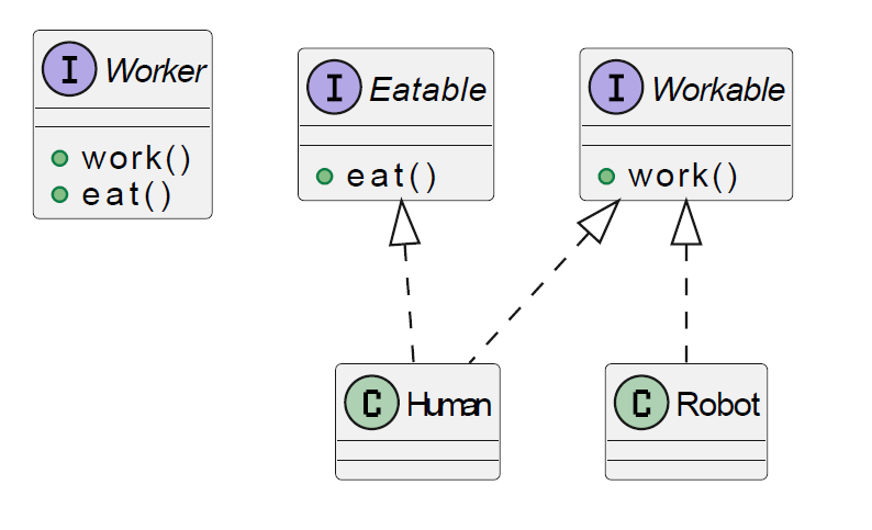 Here, segregating the Worker interface into Workable and Eatable helps ensure that Robot, which does not need to eat, does not have to implement eat().