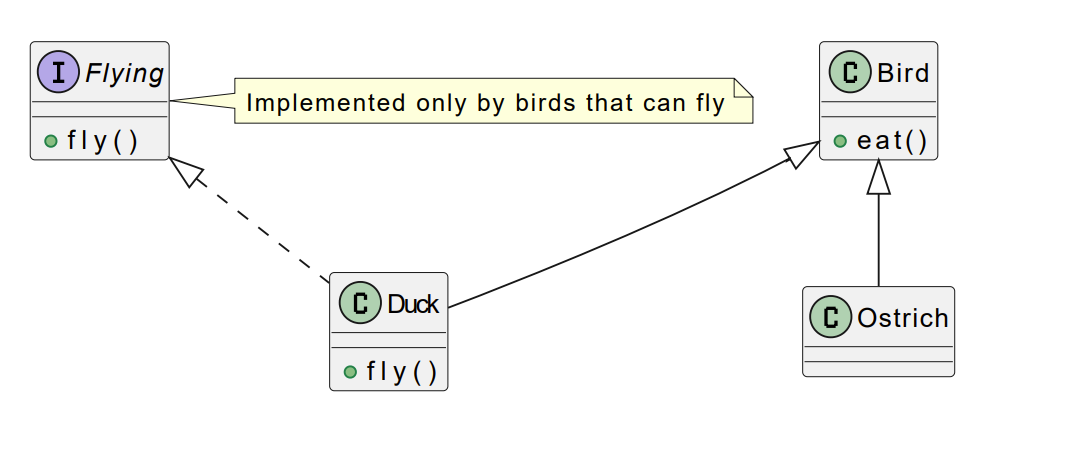 Birdbut does not implementFlying, accurately reflecting that ostriches cannot fly.