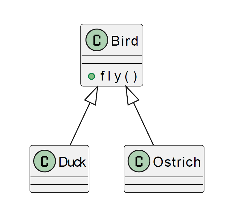 Here, using Bird as a base class for Duck and Ostrich may violate LSP since not all birds can fly (like the ostrich). This indicates a potential redesign might be necessary.