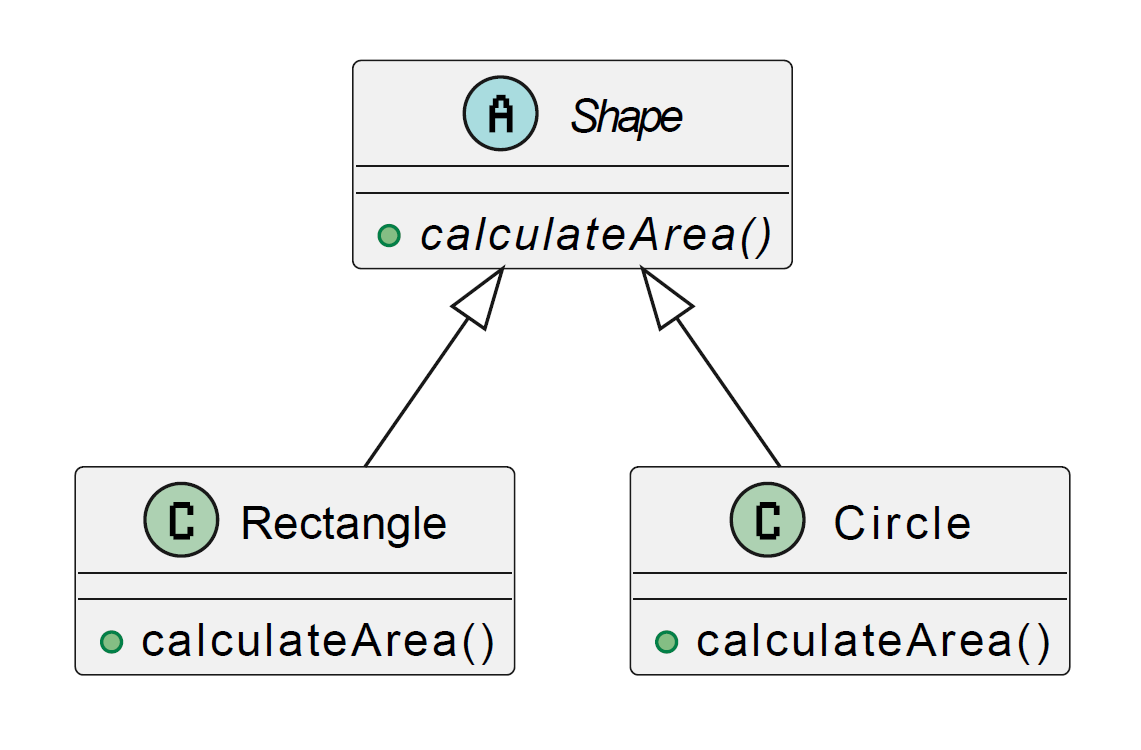 Shape is an abstract base class with different shapes like Rectangle and Circle extending it. Each can implement calculateArea differently, showing that the system is extensible without modifying existing code.
