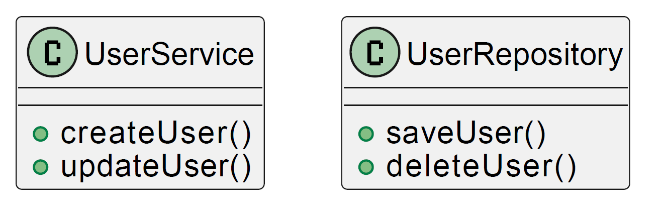 In this diagram, UserService handles user operations, and UserRepository handles database access, demonstrating SRP by separating concerns.